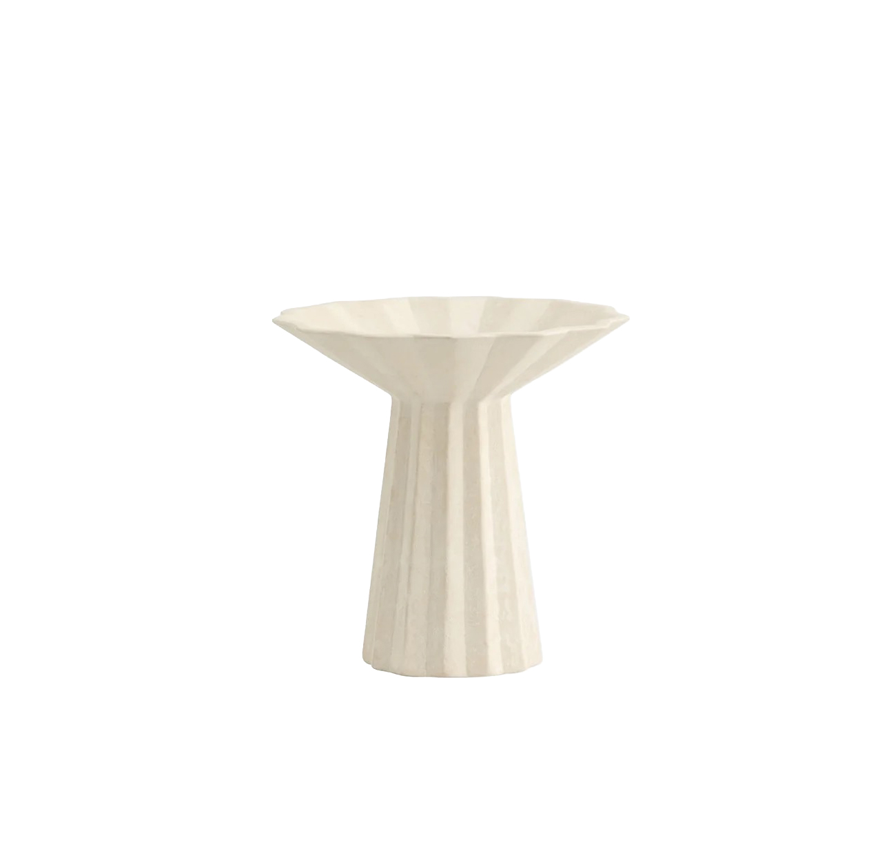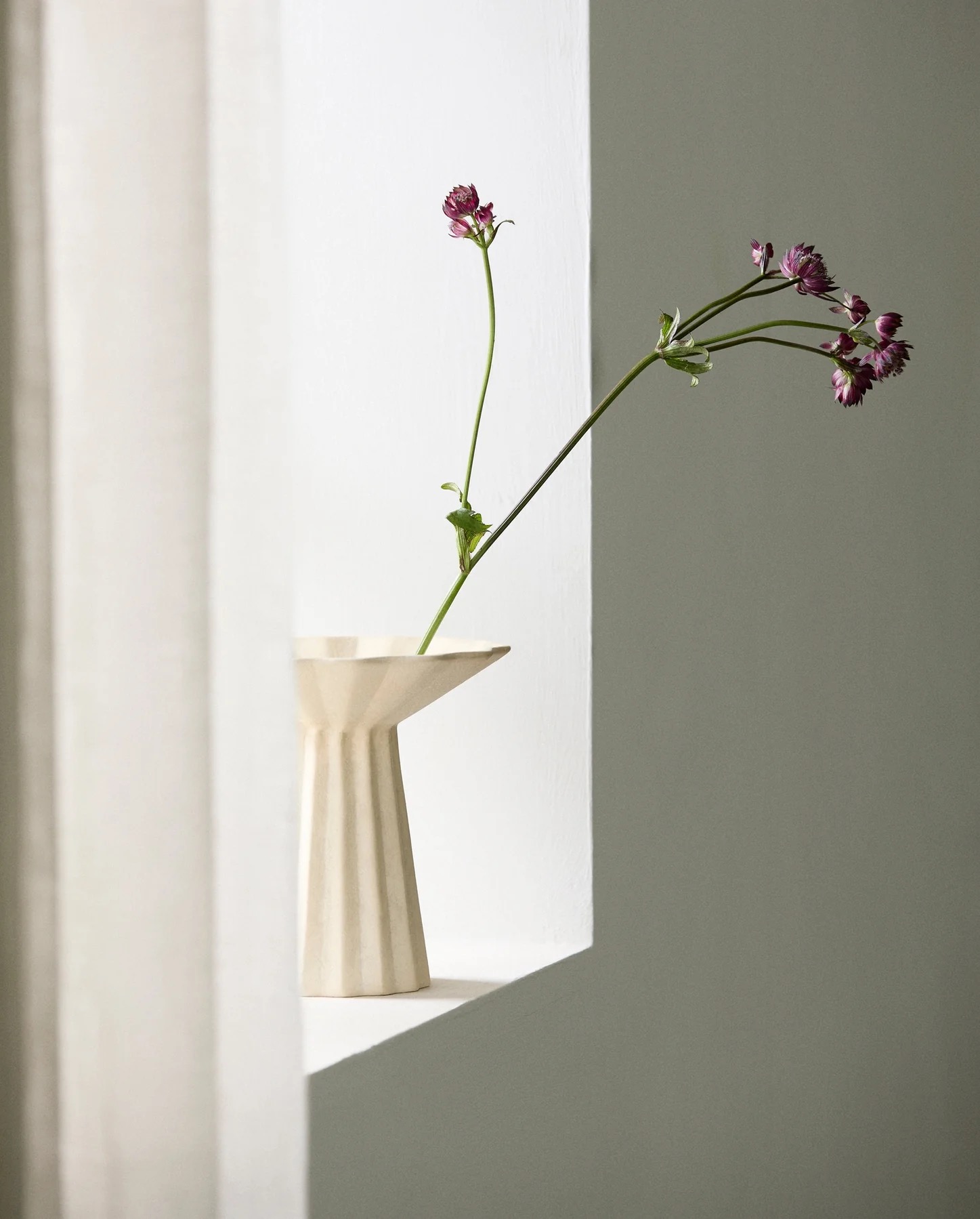 Den vackra MINU-vasen från danska Nordal är tillverkad av keramik med en texturerad yta i råvitt. Vasens räfflade mönster öppnar sig upptill och breder ut sig som en solfjäder. En elegant och skulptural vas som förhöjer utseendet på din bukett. Finns i två storlekar.