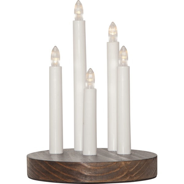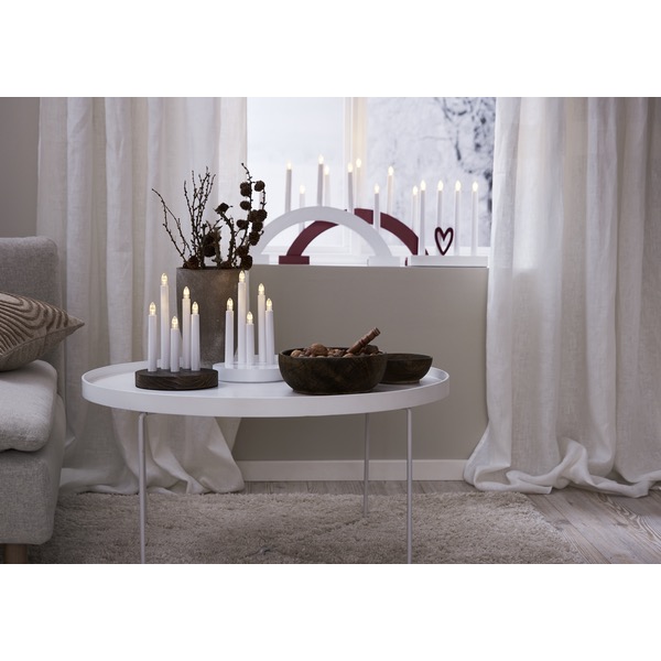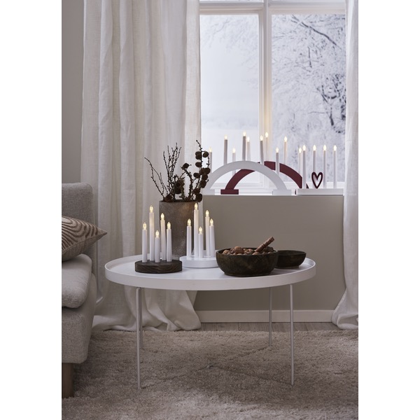 Fin och nätt adventsljusstake som tack vare att den drivs av batterier går att placera var som helst; på soffbordet, i fönstret, på hyllan eller på bordet. Tillverkad av lackerat trä. LED lampor som lyser fint och skapar julkänsla i hemmet.