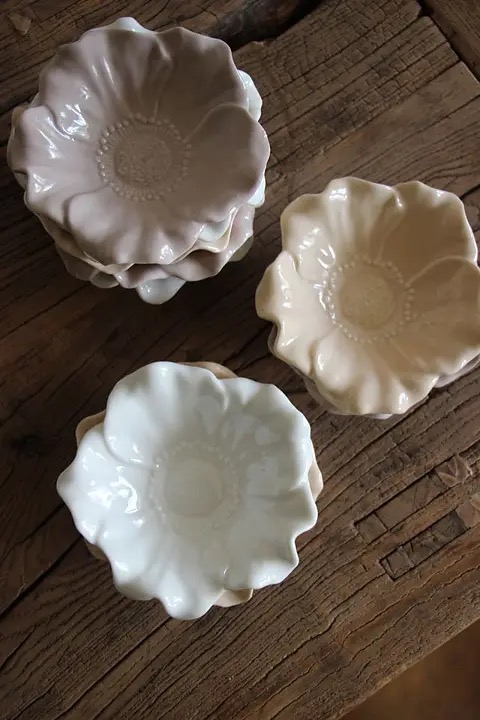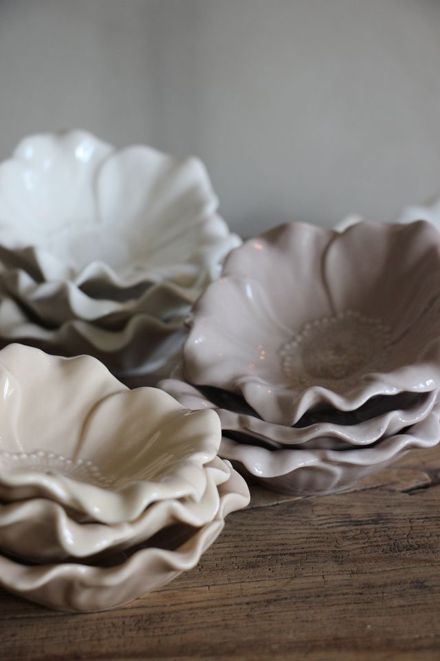 Blomstraskålarna är ljuvliga hantverk i blomstrande anda med detaljer som ger det där lilla extra till det dukade bordet. Finns i tre olika färger:  cloude, white och sand. Gjorda i keramik som tål micro och diskmaskin samt är certifierade för livsmedel.