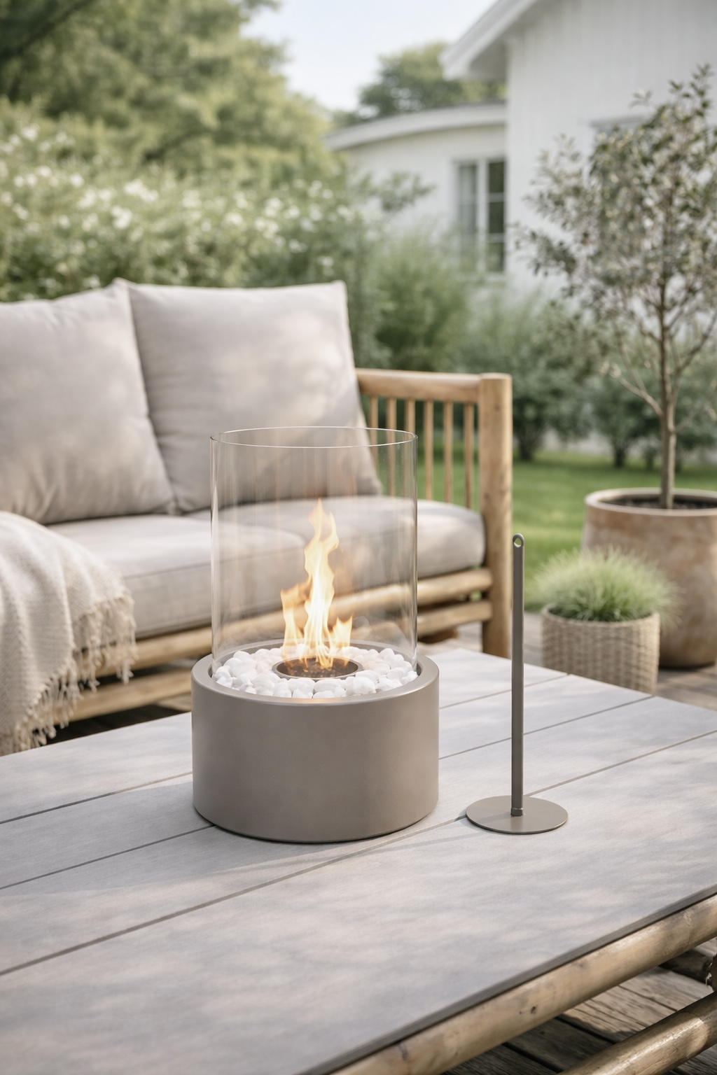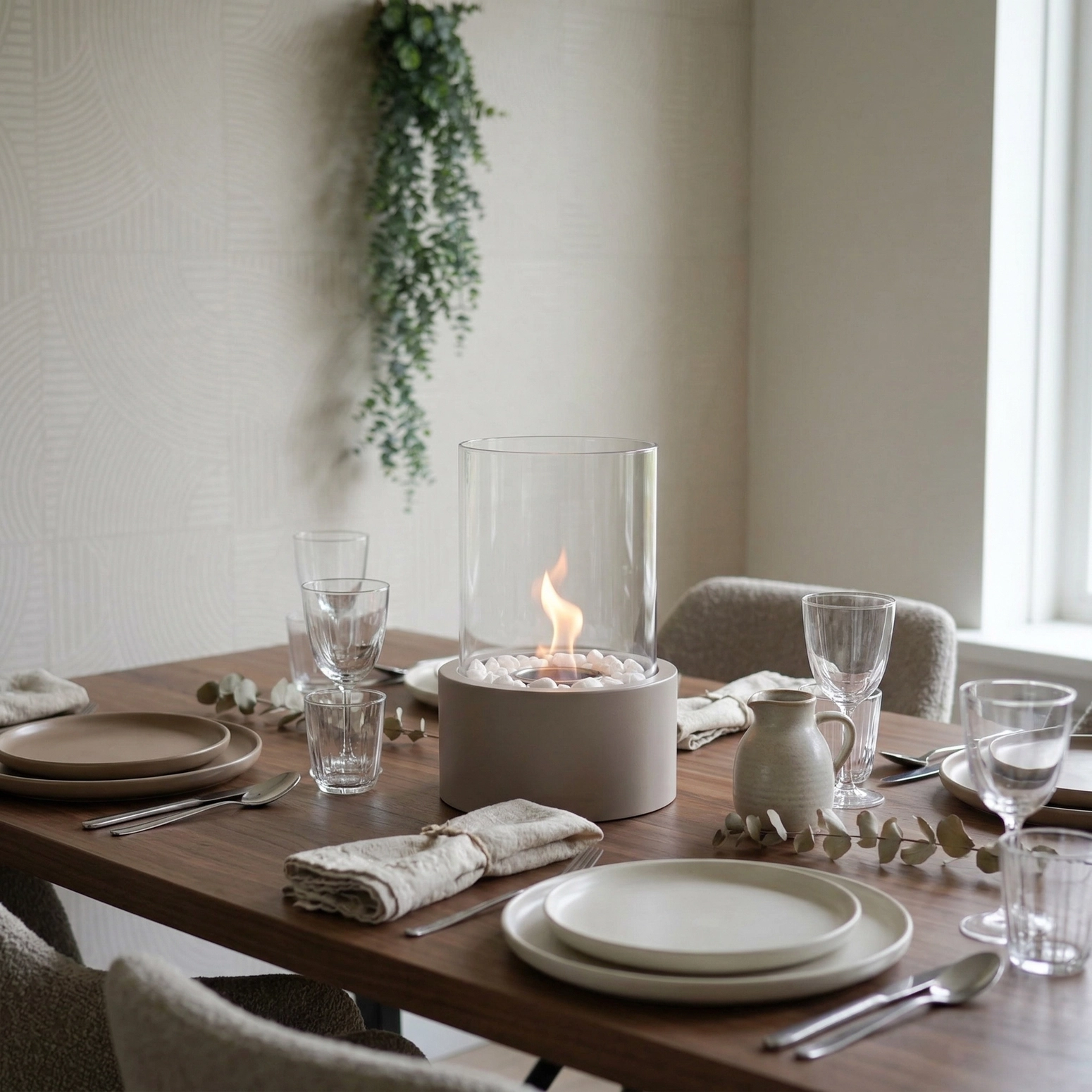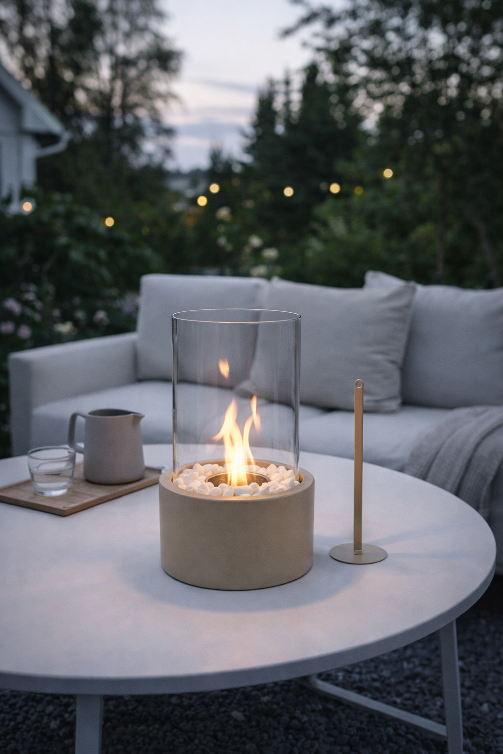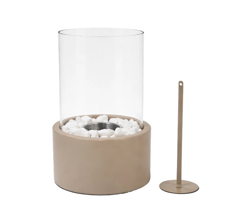 Skapa värme, stil och minnesvärda stunder i ditt hem med denna moderna, rök- och luktfria bordskamin för både inomhus- och utomhusbruk. Med sin kompakta storlek och eleganta metall- och glasdesign passar den lätt in i alla interiörer eller utomhusmiljöer. De dekorativa stenarna medföljer. Från matsalsbordet till uteplatsen är den den perfekta mittpunkten för alla tillfällen. Drivs av renförbrännande bioetanol och skapar vackra lågor utan rök eller lukt. Den medföljande brandsläckaren i metall gör att du enkelt och säkert kan släcka lågan när du vill.