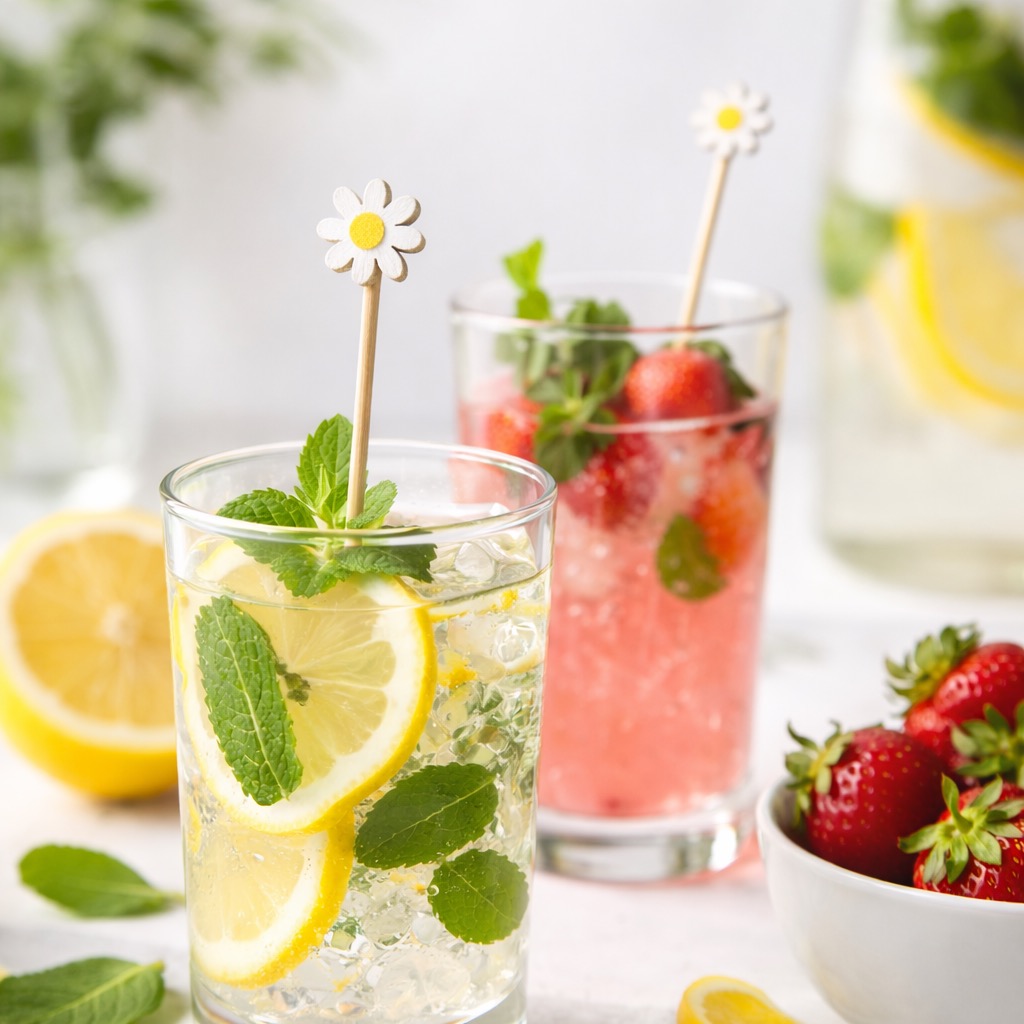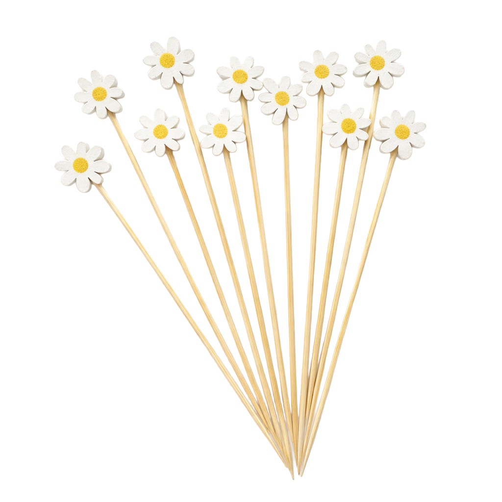 Dekorativa drinkpinnar med blommotiv i form av vita prästkragar med gul mitt. Perfekta för cocktails, drinkar, desserter, snacks eller som festdekoration vid sommarfester, bröllop och garden parties.