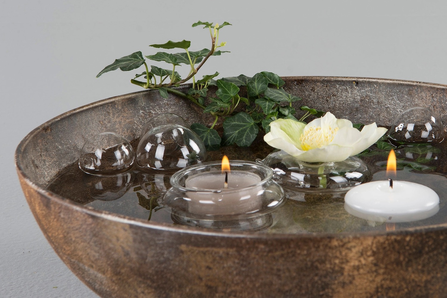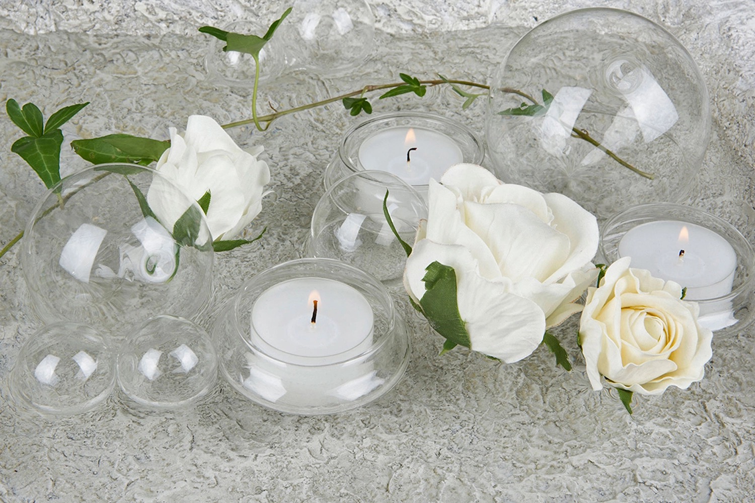 Runda flytkoppar av glas som passar med värmeljus. Fina att ha i en skål med vatten tillsammans med växter och flytljus. Innehåller 23 st flytkoppar.