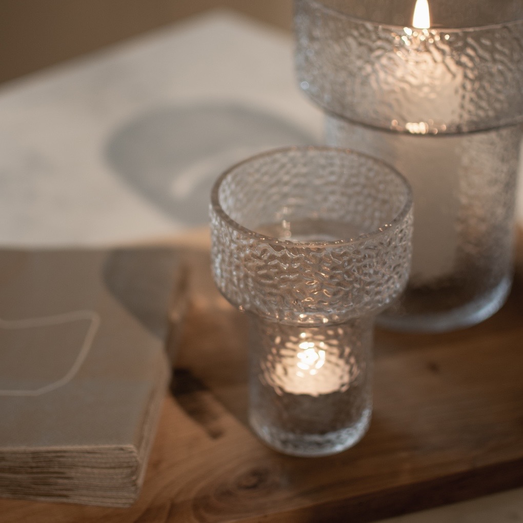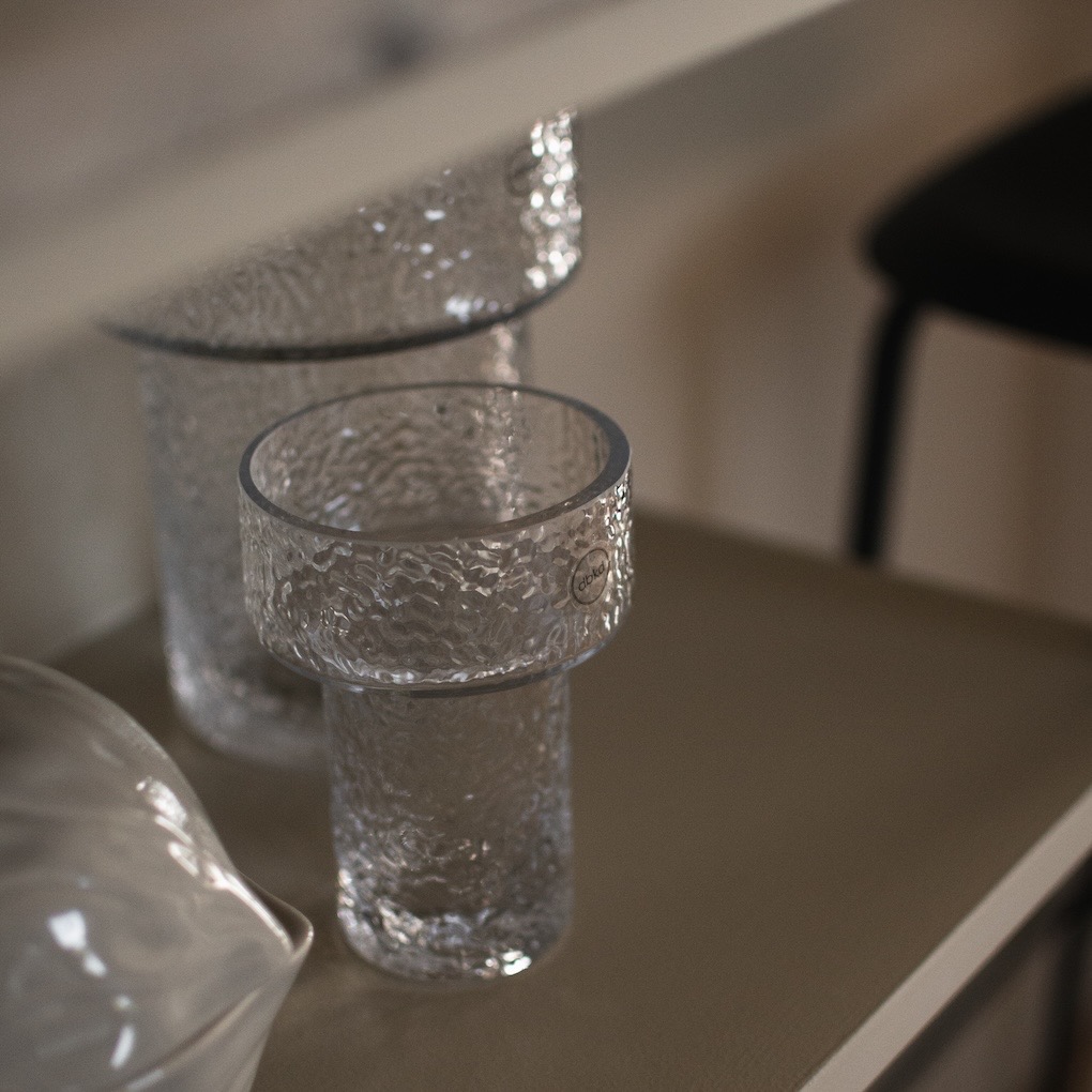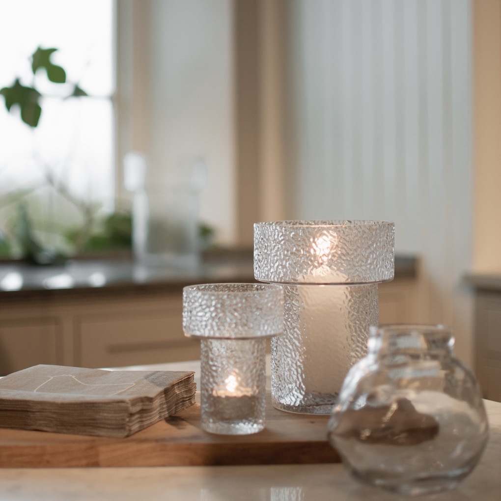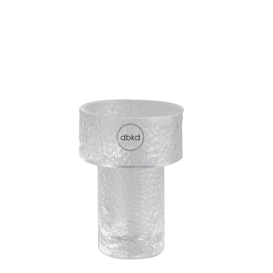 Glasvasen/ljuslyktan Keeper från DBKD med den grova strukturen är perfekt för en liten bukett, några strån eller ett litet värmeljus. Du kan helt enkelt framhäva vasen med vöxter eller använda den som ljushållare. Vasen är även snygg i kombination med Airy-serien, mindre vaser ser ofta bra ut när de kombineras med varandra. Finns även i en större storlek.