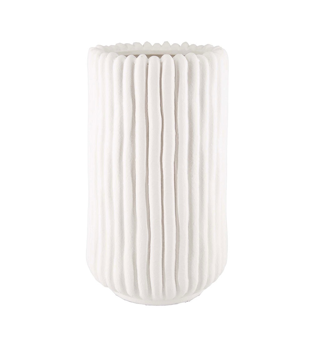 Lainey är en vacker rund vit vas gjord av terrakotta. Ställ den på golvet och fyll den med strån, pampasgräs, grenar eller några höga blommor. Lika fin på sommaren med vasstrån som på vintern med amaryllis.