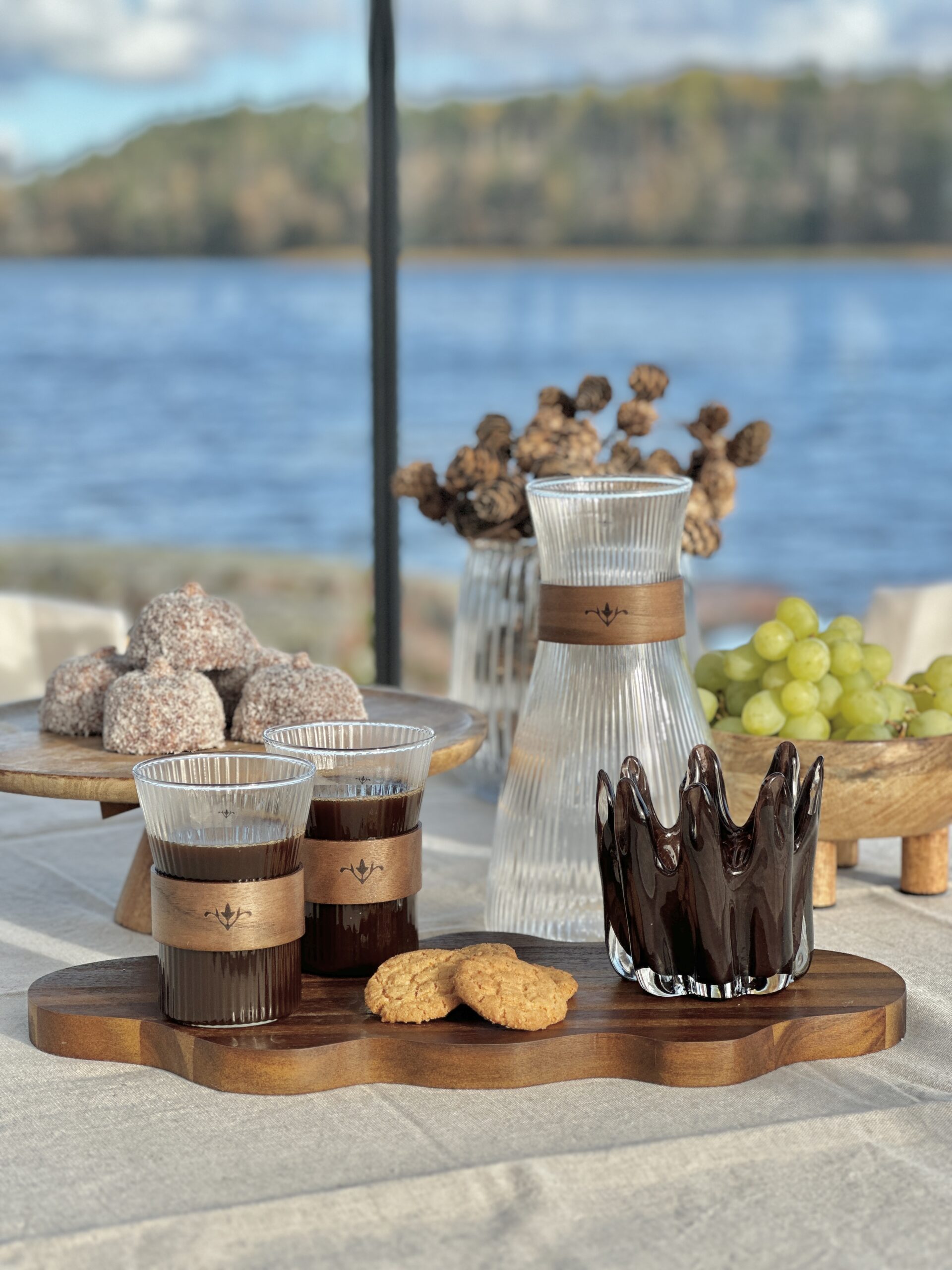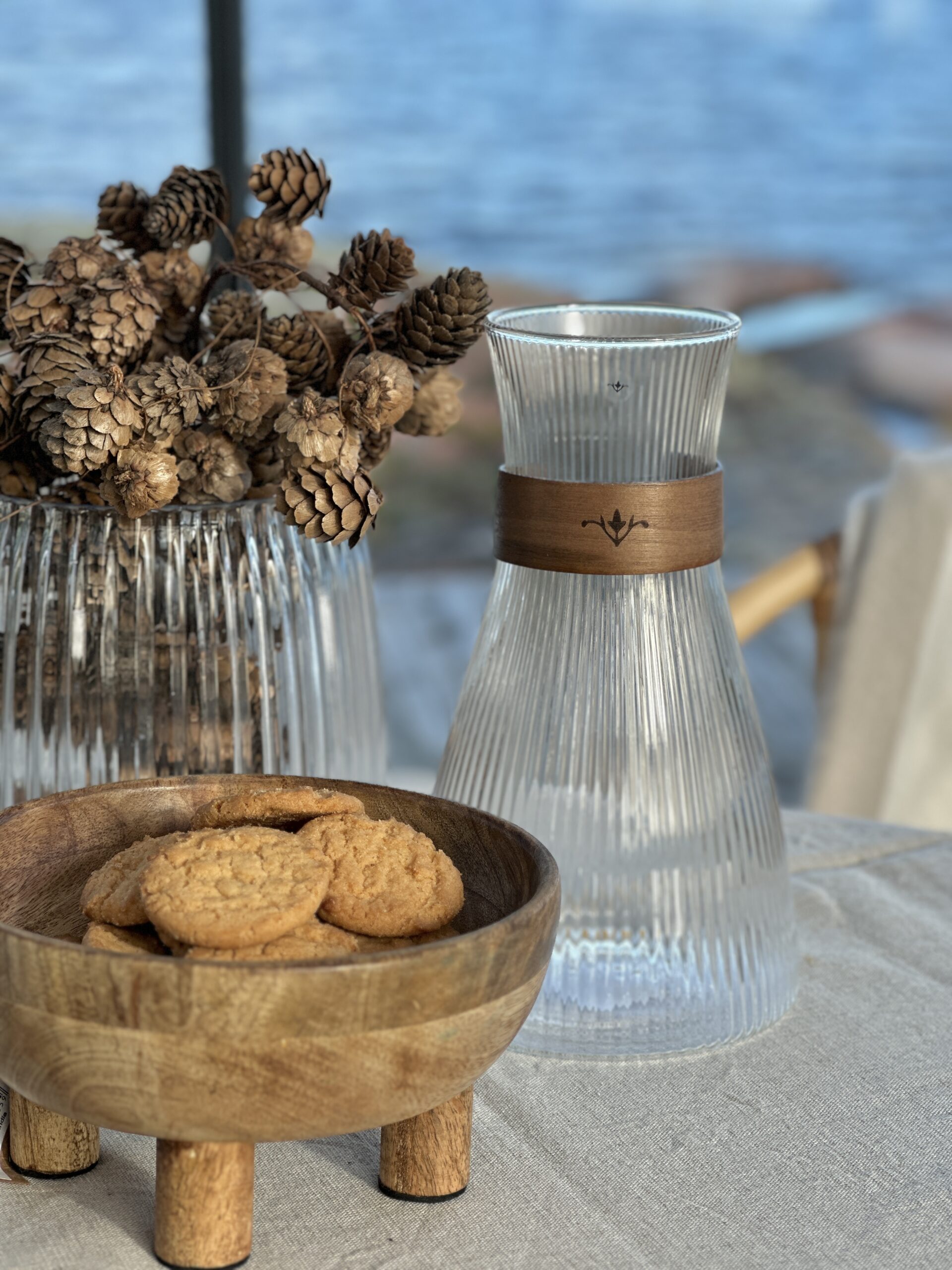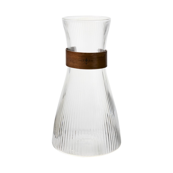 Vacker glaskanna med skyddande och dekorativ trädetalj runtom. Kan användas för både kalla och varma drycker. Finns även matchande koppar i två storlekar.
