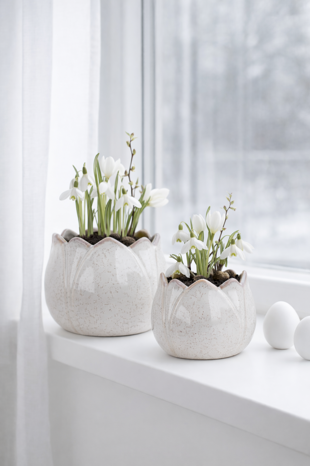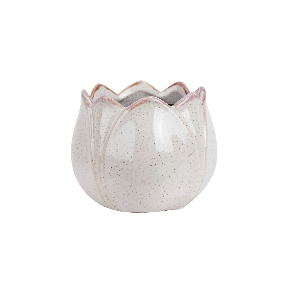 Dekorativ kruka av vit keramik i form av en blomknopp. Fin som den är eller fylld med en växt eller en vårlök. Finns även en större kruka i samma serie, kombinera för en vårinspirerad grupp.