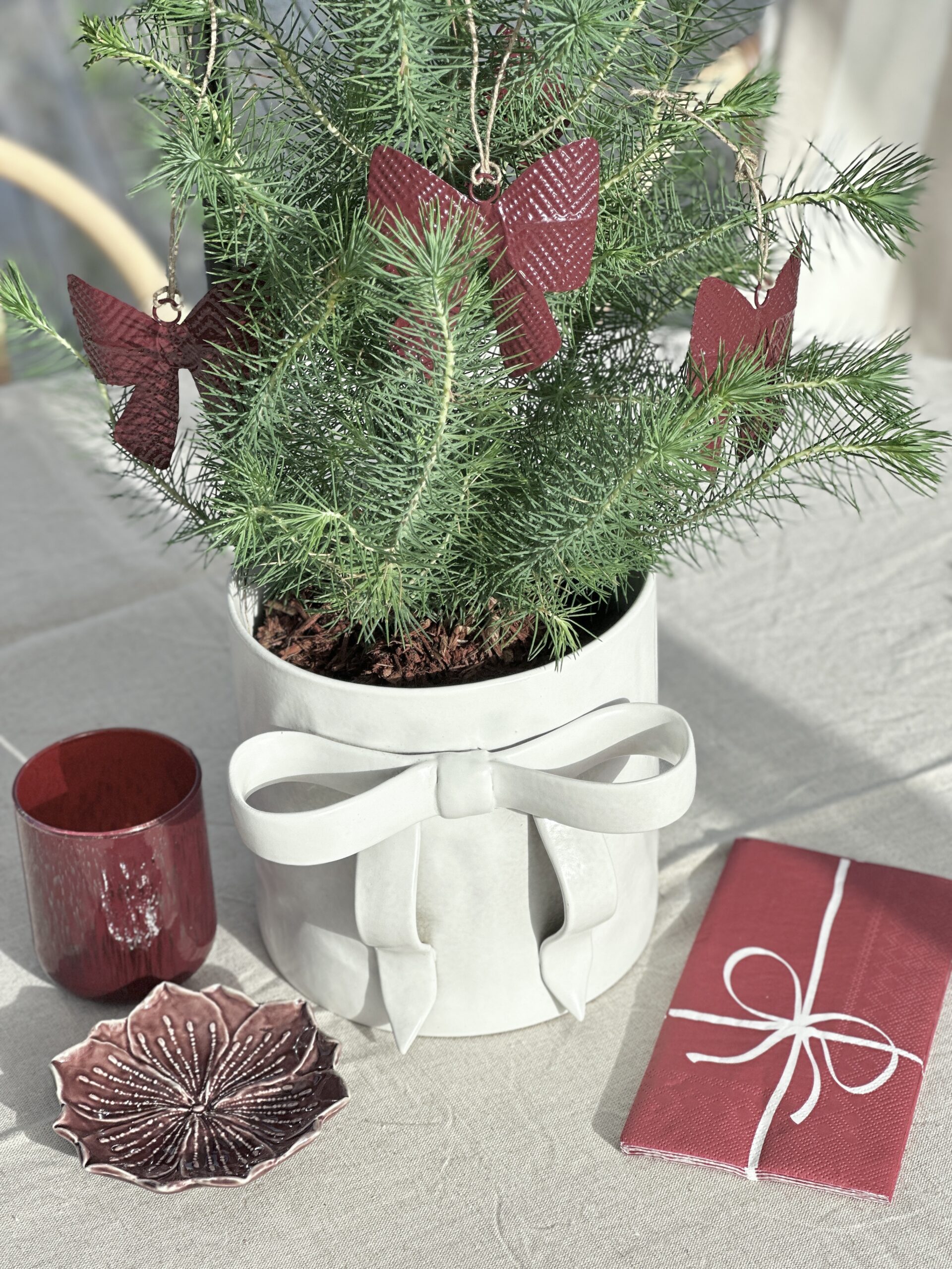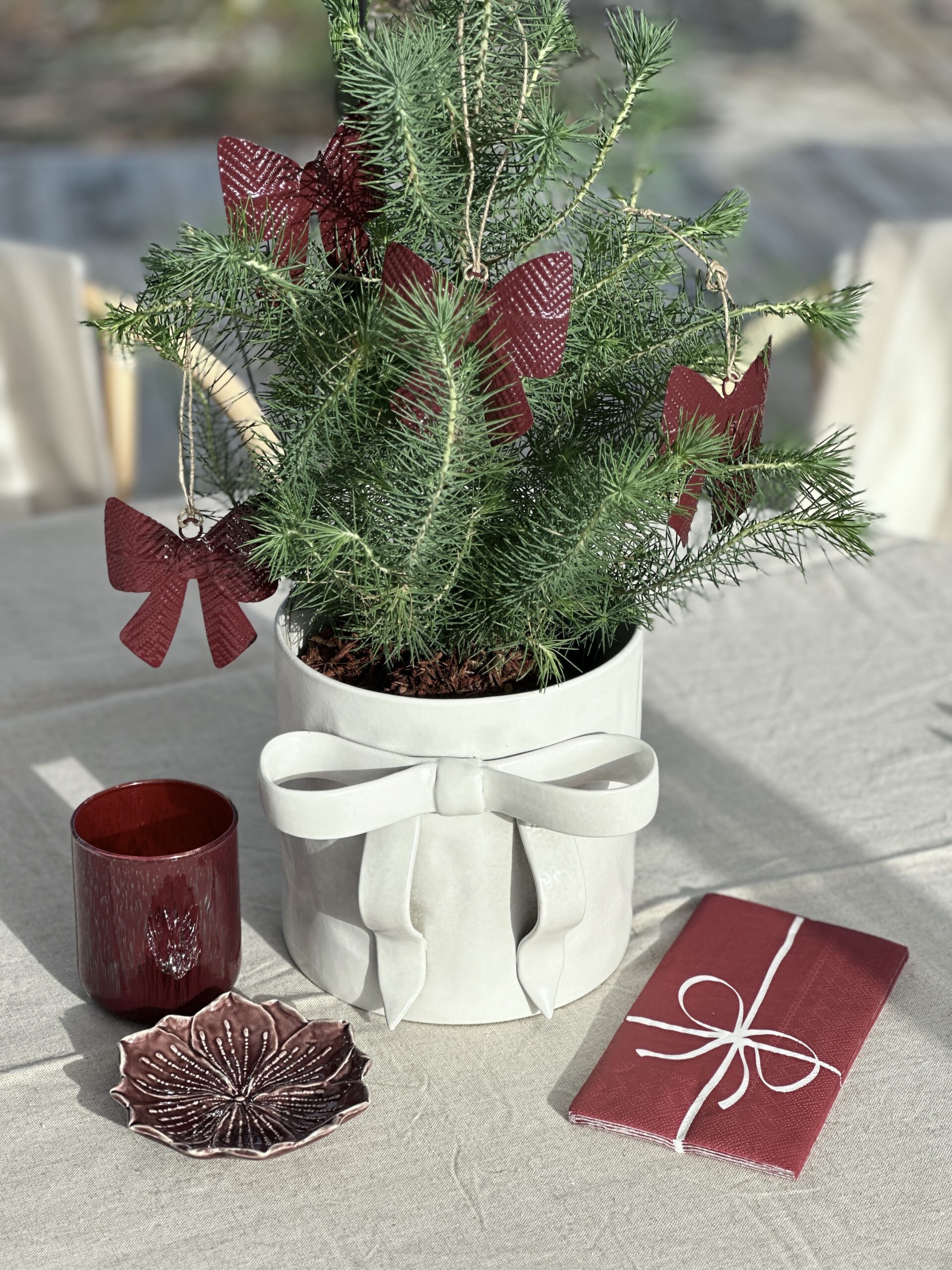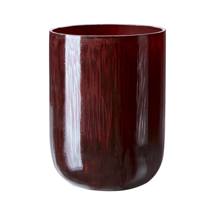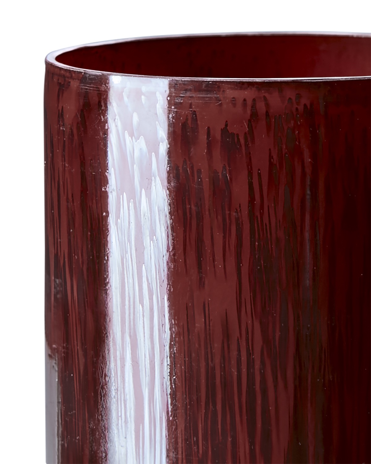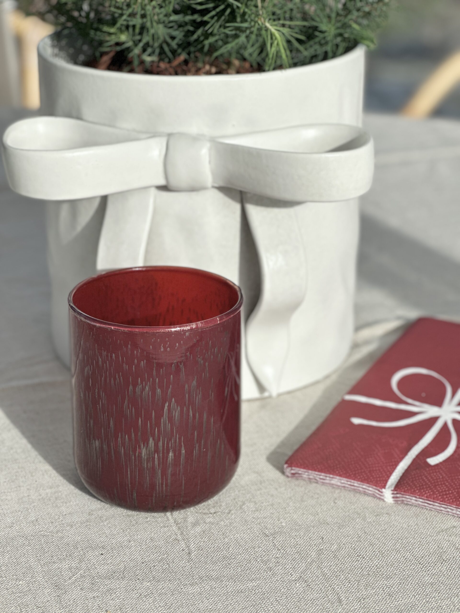 Vacker ljuslykta i röda nyanser med ett spraymålat mönster som ge en vacker yta. Ger ett varmt och juligt sken. Passar för värmeljus.