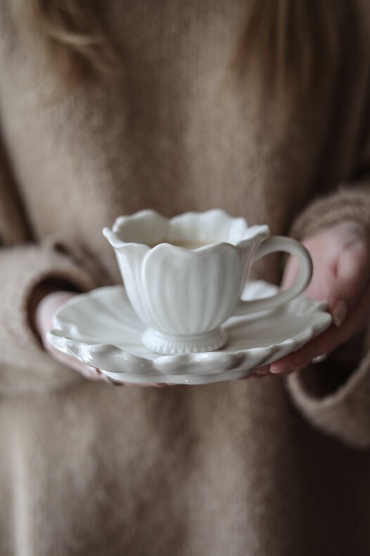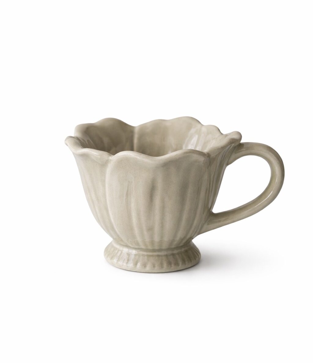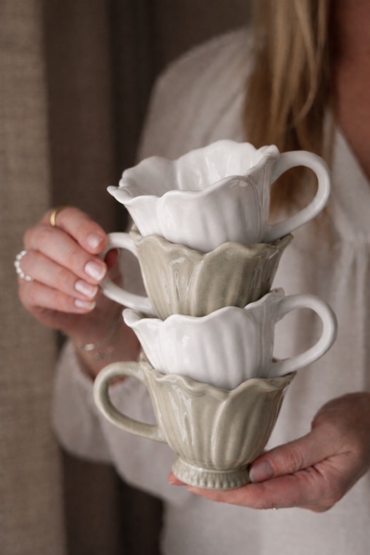 Blomstramuggarna är ljuvliga hantverk i blomstrande anda med detaljer som ger det där lilla extra till det dukade bordet. Perfekt för kaffe, cappuchino, latte, te eller varm choklad. Matcha med fat samt små söta skålar i samma blommande serie. BLanda vita och beigfärgade koppar och fat för en extra fin dukning. Finns i färgerna Mussla (beige) & Vit