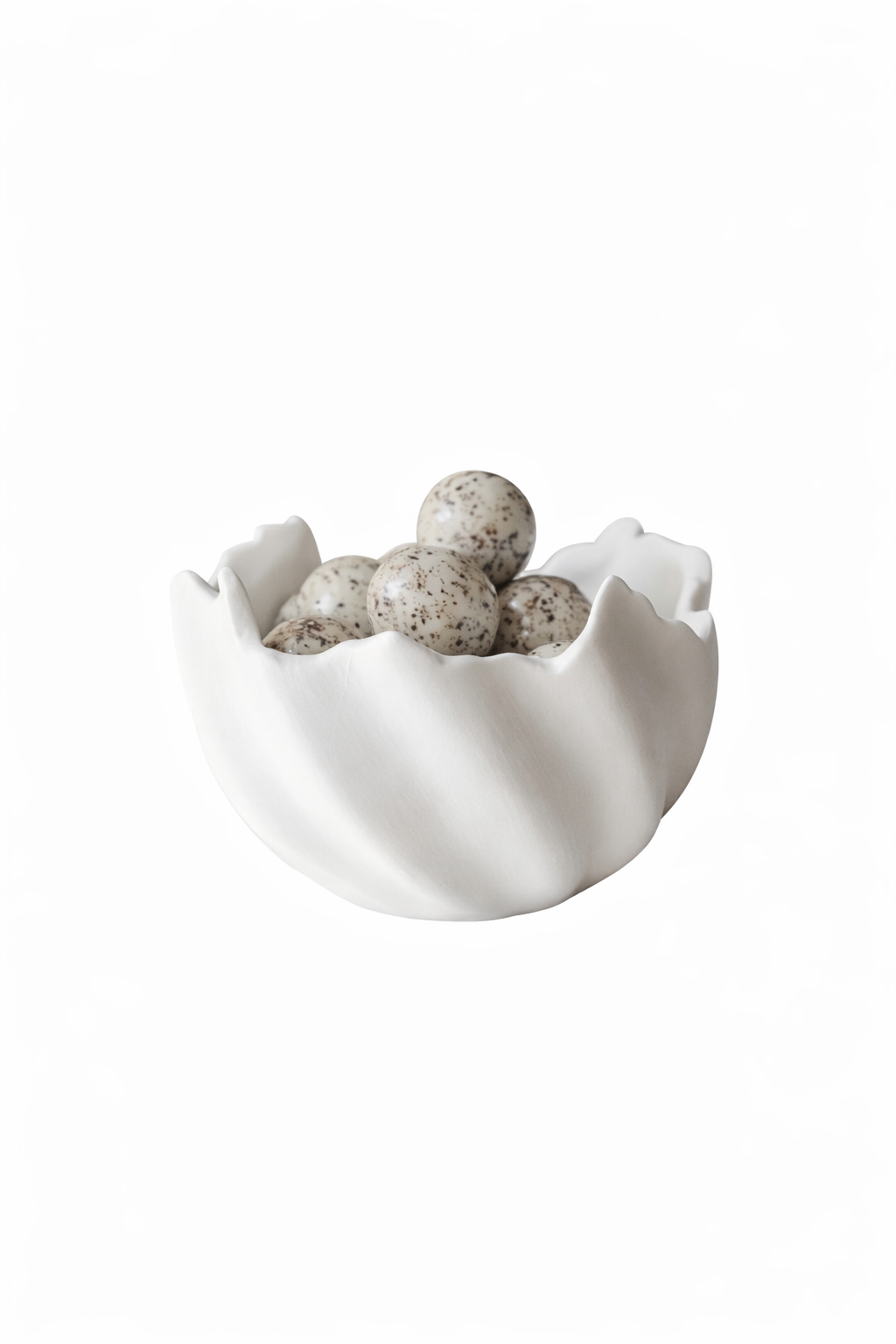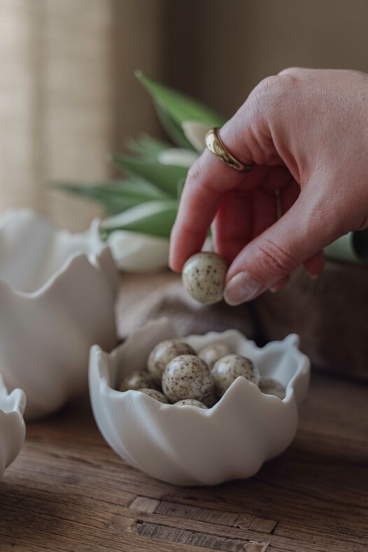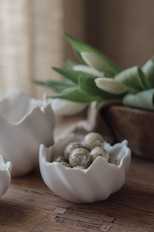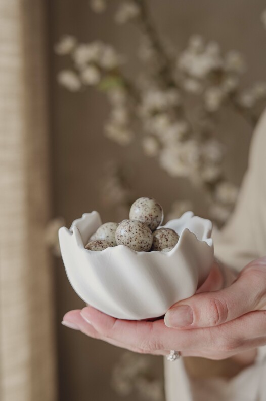 Underbar handgjord skål/lykta i form av ett äggskal av matt keramik från svenska Majas Cottage. Fyll det med godis, ett värmeljus eller en liten växt. Finns i två storlekar. Majas påsksaker är framtagna för att skänka hopp och glädje i påskens fina säsong. Med vackra detaljer i designen blir det fina inslag i hemmet under påsken.