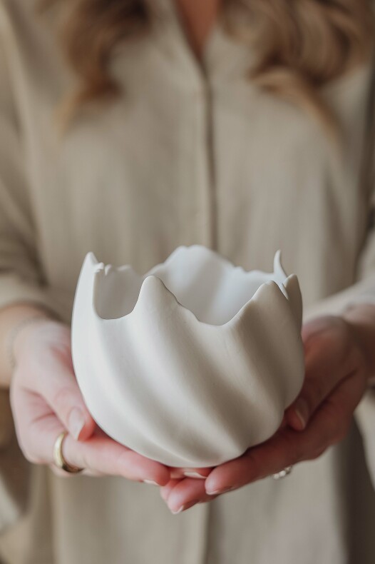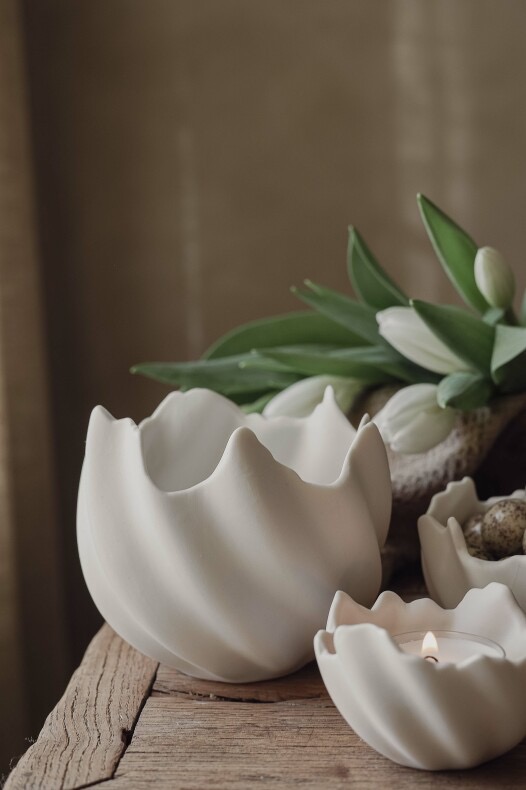Underbar handgjord skål/lykta i form av ett äggskal av matt keramik från svenska Majas Cottage. Fyll det med godis, ett värmeljus eller en liten växt. Finns i två storlekar. Majas påsksaker är framtagna för att skänka hopp och glädje i påskens fina säsong. Med vackra detaljer i designen blir det fina inslag i hemmet under påsken.