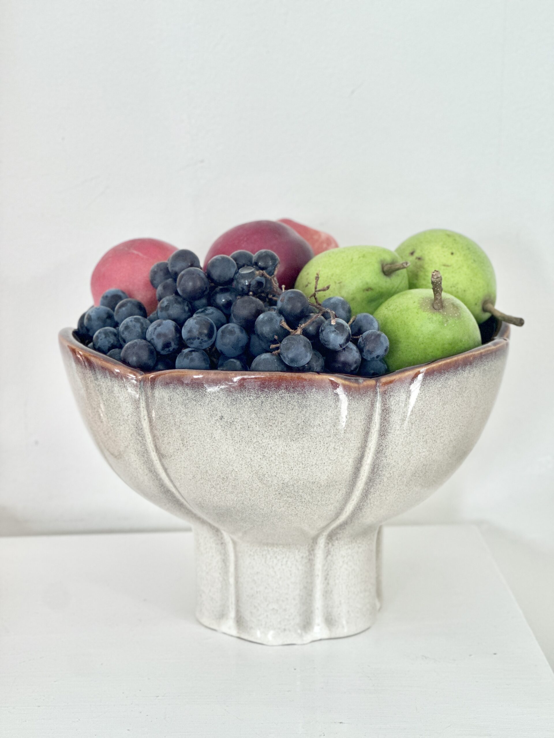 Vacker skål på fot i beigemelerat porslin. Perfekt för planteringar, krukväxter eller uppläggning.