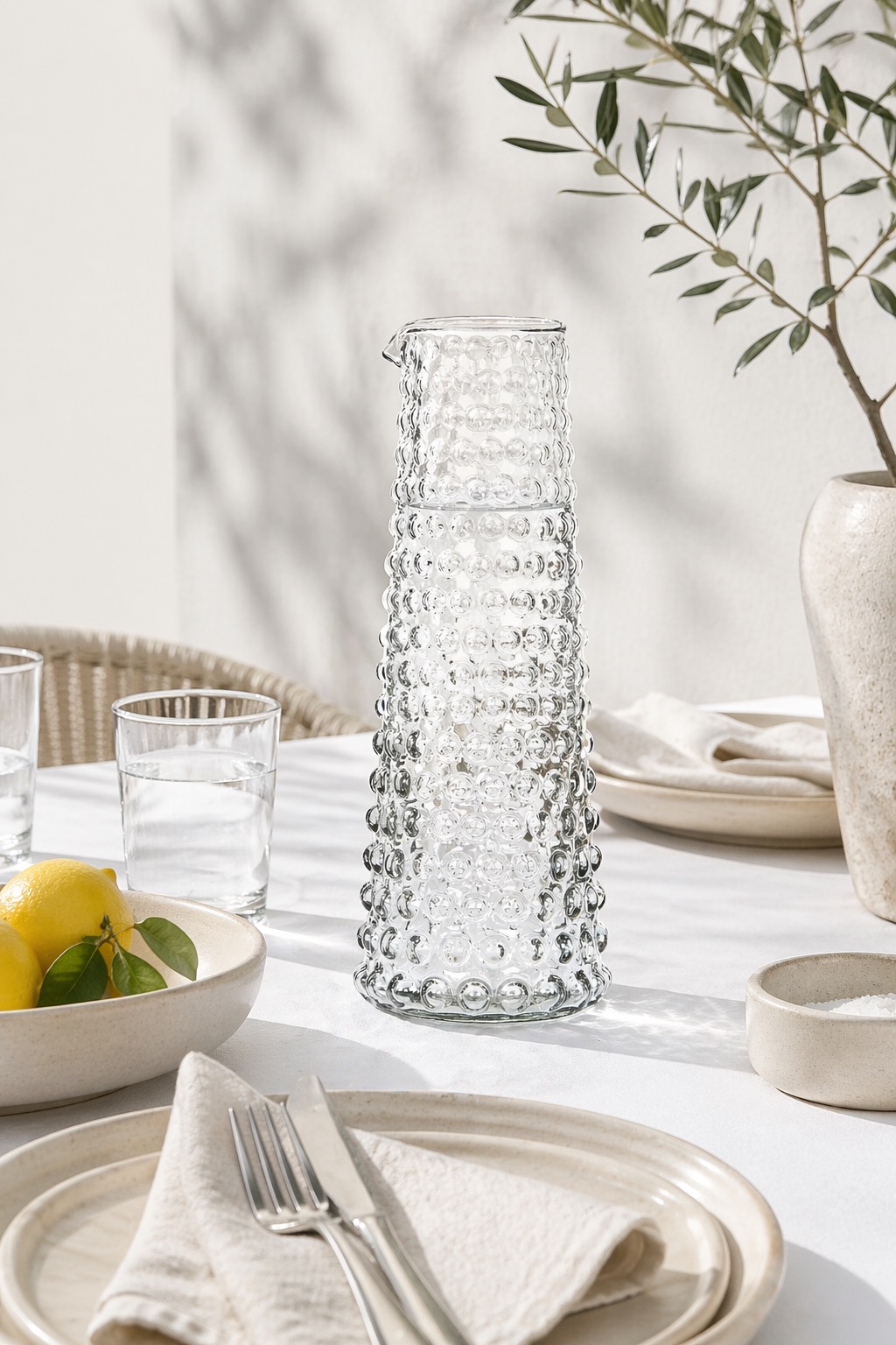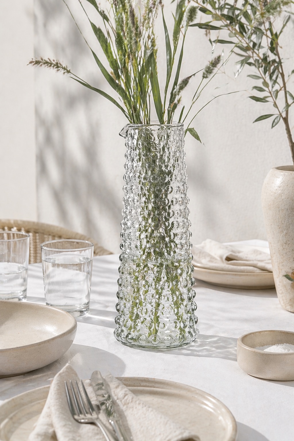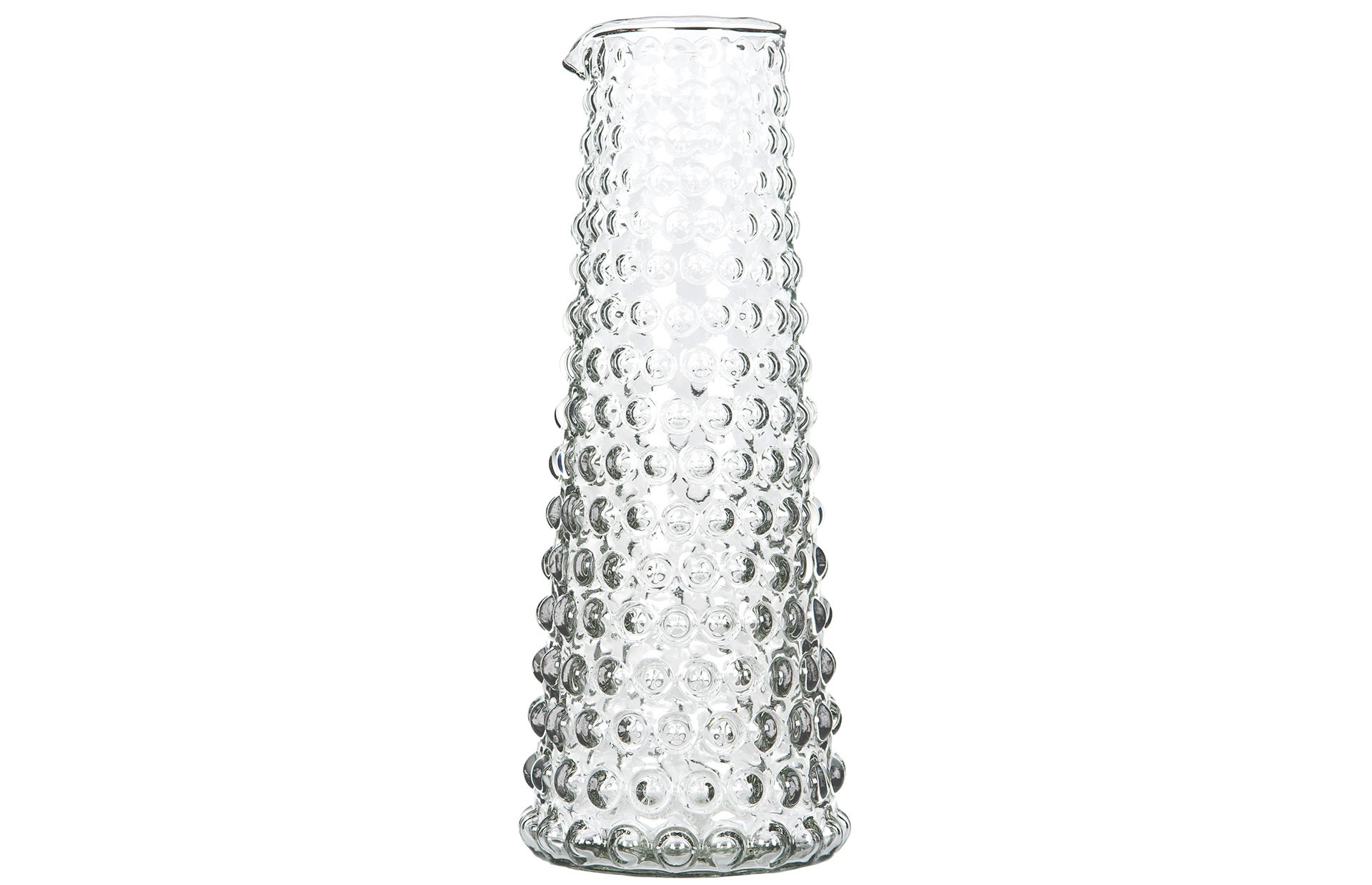 Vacker och tidlös tillbringare / vas som passar i alla hem. Bubblig form med en pip upptill. Perfekt för att servera vatten eller andra drycker eller som en uttrycksfull vas med några strån eller kvistar. Finns även i en mindre modell.