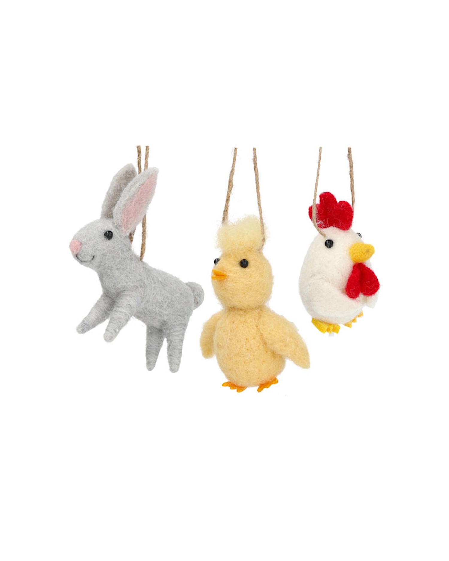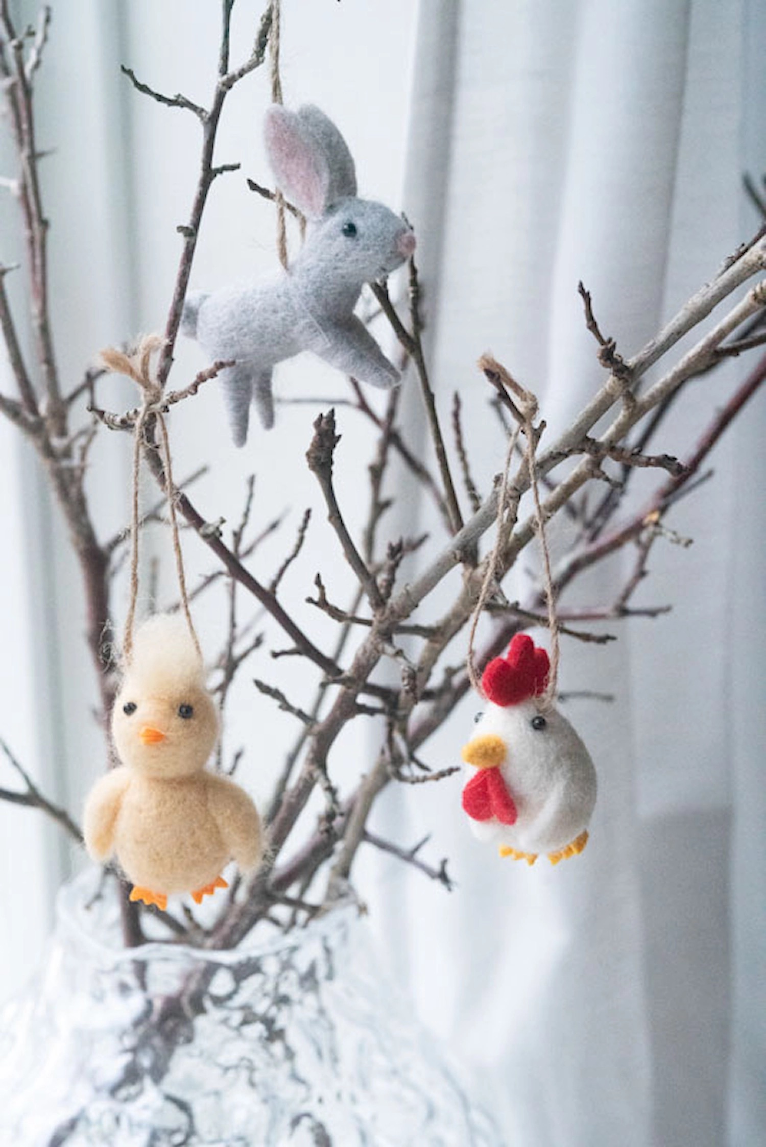 Pynta påskriset med en söt kanin, kyckling och höna av naturlig ull. Snöre för att hänga i.