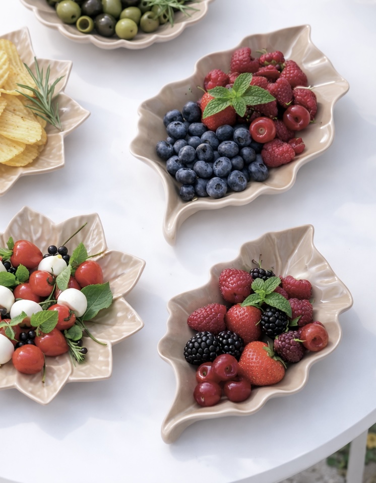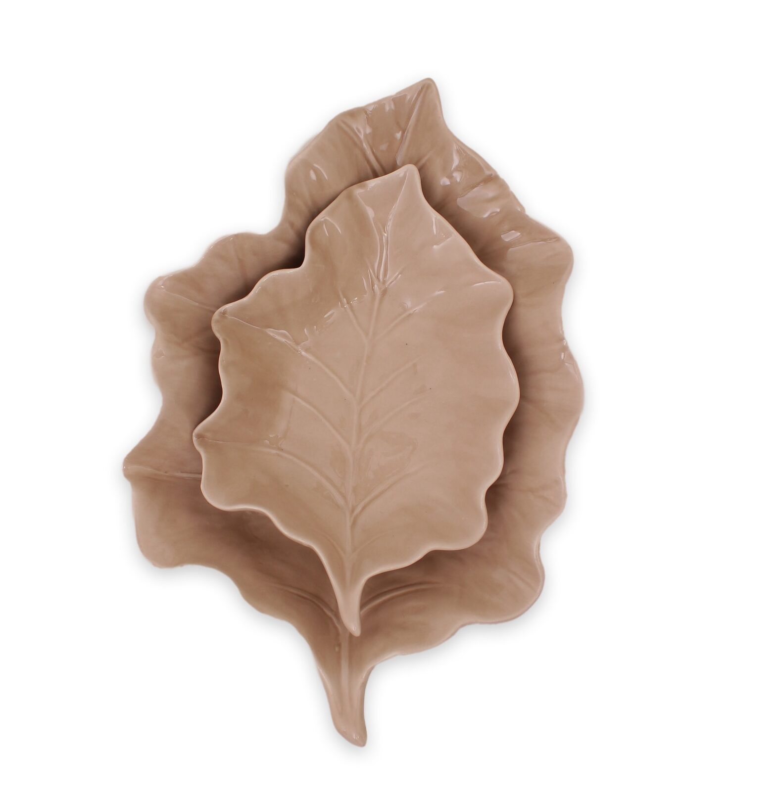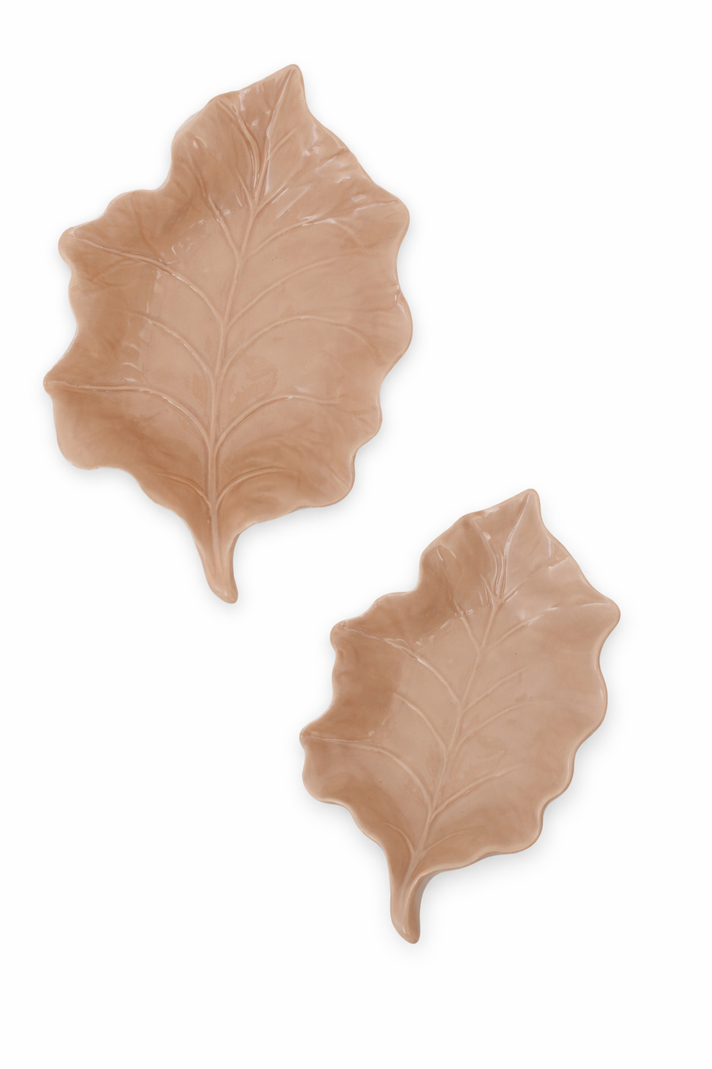 Två stycken vackra uppläggningsfat av beige keramik i form av blad. Passar perfekt för sallader, grönsaker, snacks, godis, kakor, mm. Eller bara fina som de är som en del av inredningen. Finns i beig och grön.