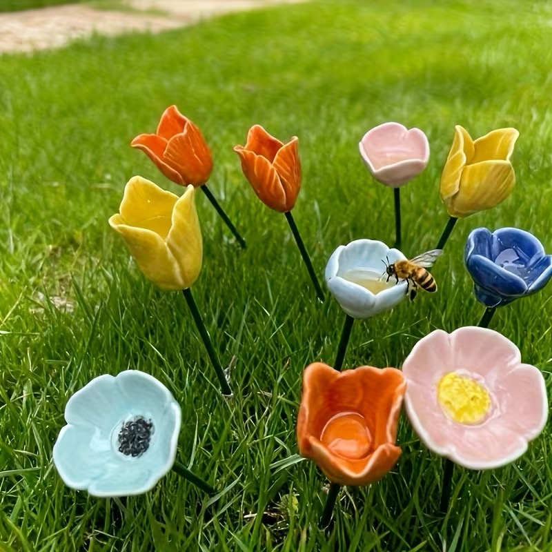 Handgjord sommarblomma av keramik på en träpinne, som fungerar både som en fin dekoration i en kruka eller rabatten men även som en viktigt vattenbad för små bin. Biet kan dricka vattnet och har då större chans att överleva en varm och torr sommar. Finns i flera olika färger.