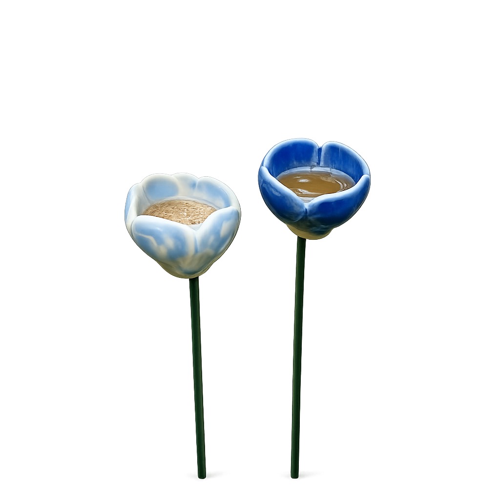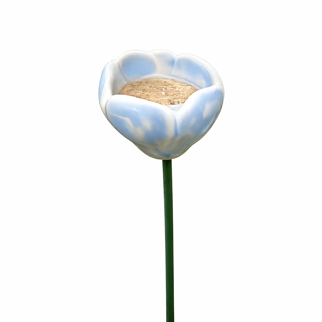 Handgjord sommarblomma av keramik på en träpinne, som fungerar både som en fin dekoration i en kruka eller rabatten men även som en viktigt vattenbad för små bin. Biet kan dricka vattnet och har då större chans att överleva en varm och torr sommar. Finns i flera olika färger.